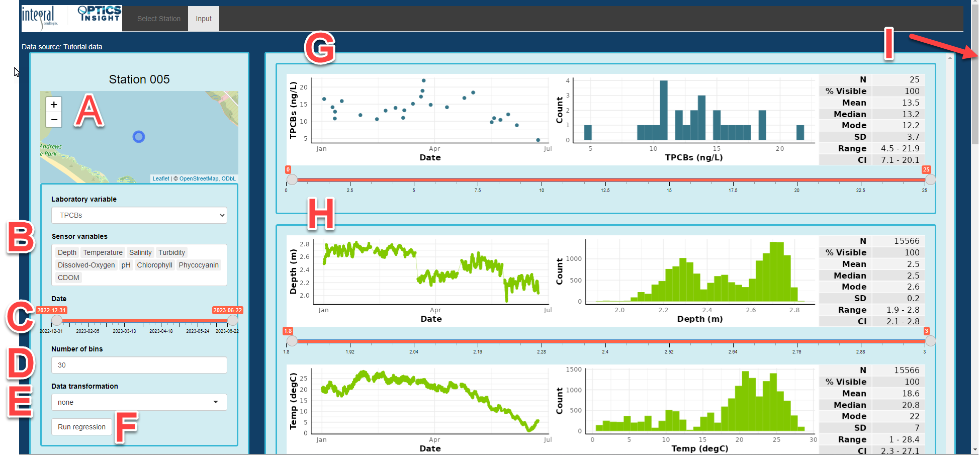 Once a station is selected from the “Select Station” tab, an “Input” tab is generated to display all information contained in the selected station folder. The “Input” tab allows for user interaction with the laboratory and sensor variables, and filters by date or specific variable range in order to control what parameters contribute to the regression analysis.