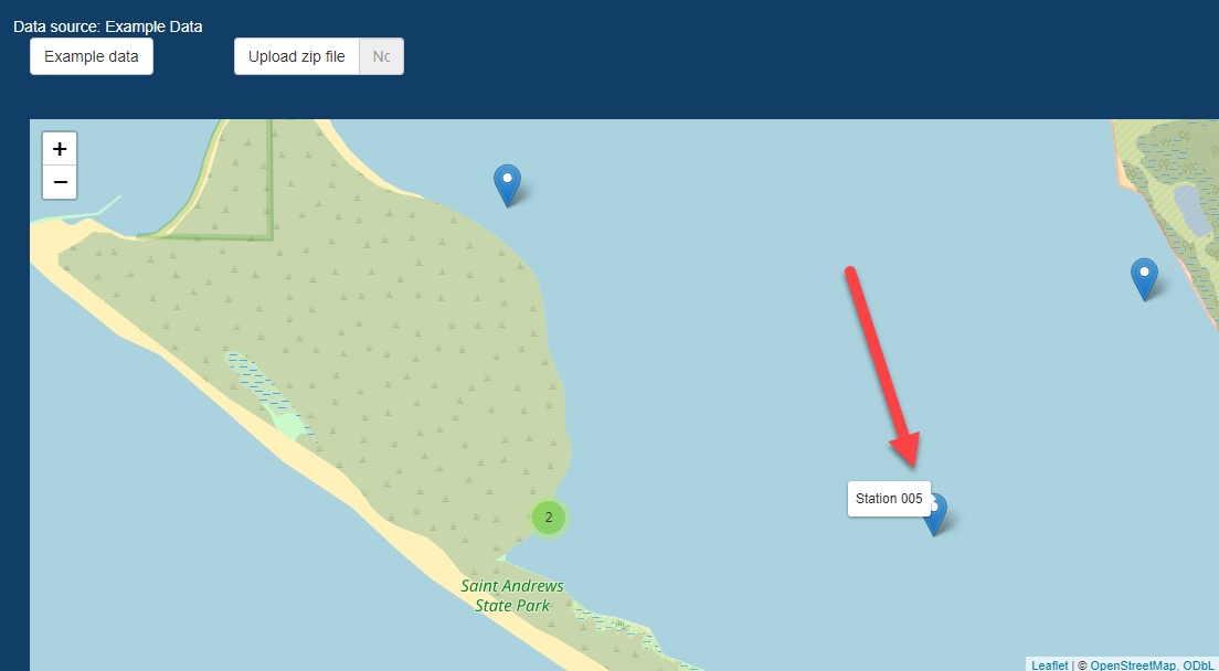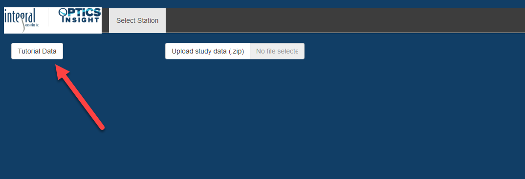 Load Data: The tool opens to a dark blue screen with two options, “Tutorial Data” and “Upload study data (zip).” Select the “Tutorial Data” option, and a map should instantly appear in the space below the data selection buttons. If you were using OPTICS for your own data, you would instead upload a zipped folder with prepared csvs for each station.