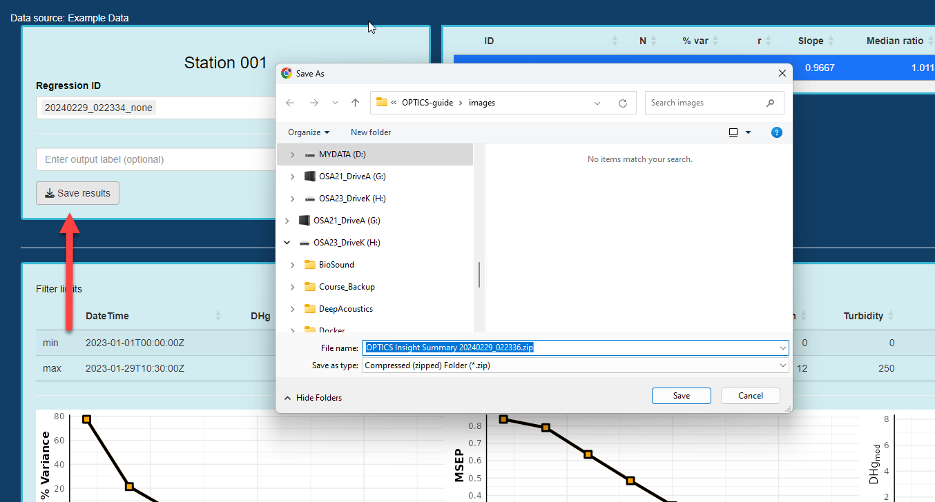 After reviewing the data, select the “Save results” button. This will save all results of your analysis in zipped file labeled with “OPTICS Insight Summary…” along with the date and time you generated the results. Identify a location to save your results.