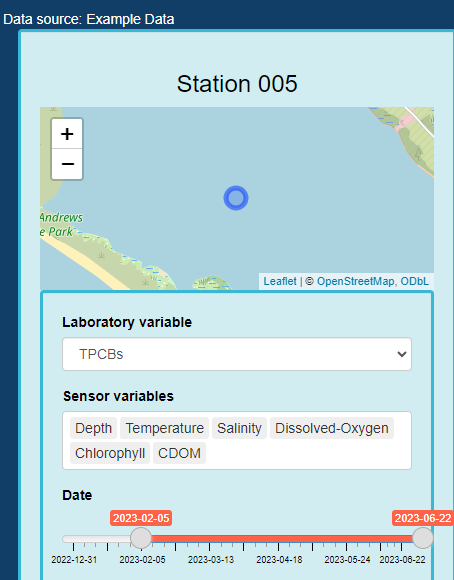 The next steps take you through data visualization. This data consists of all data that was made available in the provided folder, and in this instance, all environmental and contaminant variables that are contributing to the demonstration. For additional information regarding file format and required csv structure, visit the “Getting Started” section. When you click on the “Station 005” above, the “Input” tab will display with the following details: