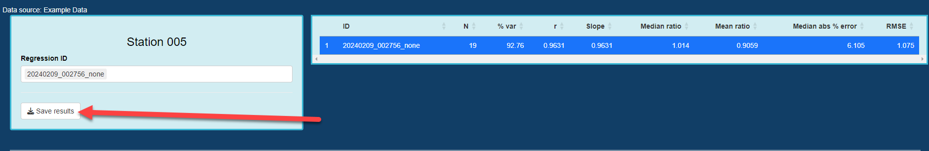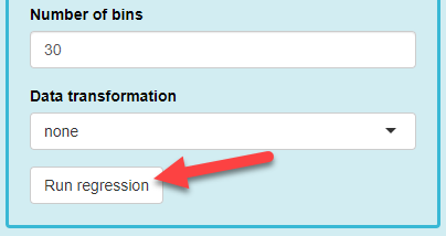 Navigate back to the side panel on the left one more time, and scroll down to the bottom section of the panel under “Station 005.” You will notice there is a “Number of bins” value, a “Data transformation” value, and a “Run regression” button. For our first run, keep these defaults and select the “Run regression” button.